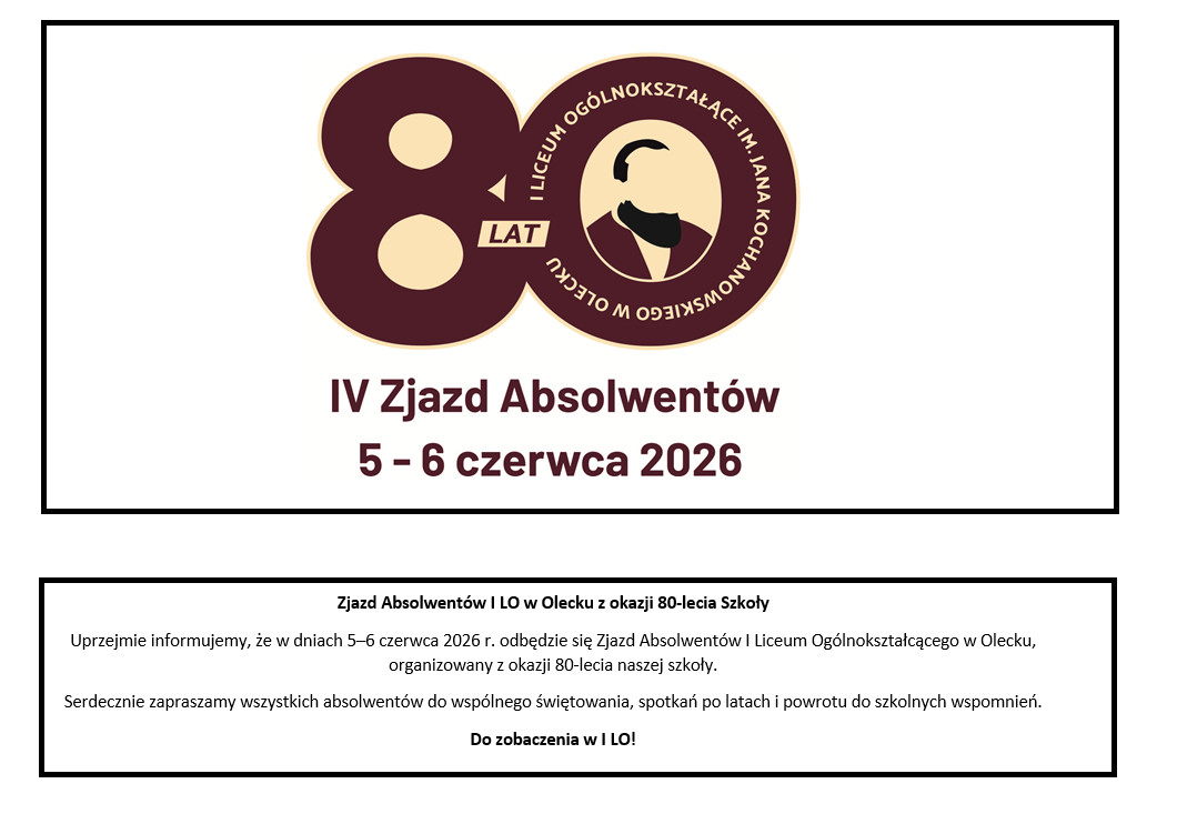 Dnia 1 września 2025r. (poniedziałek) o godzinie 9.00 w I LO im. J. Kochanowskiego w Olecku odbędzie się uroczyste rozpoczęcie roku szkolnego 2025/26. Rozpoczęcie roku odbędzie się w sali gimnastycznej.[…]