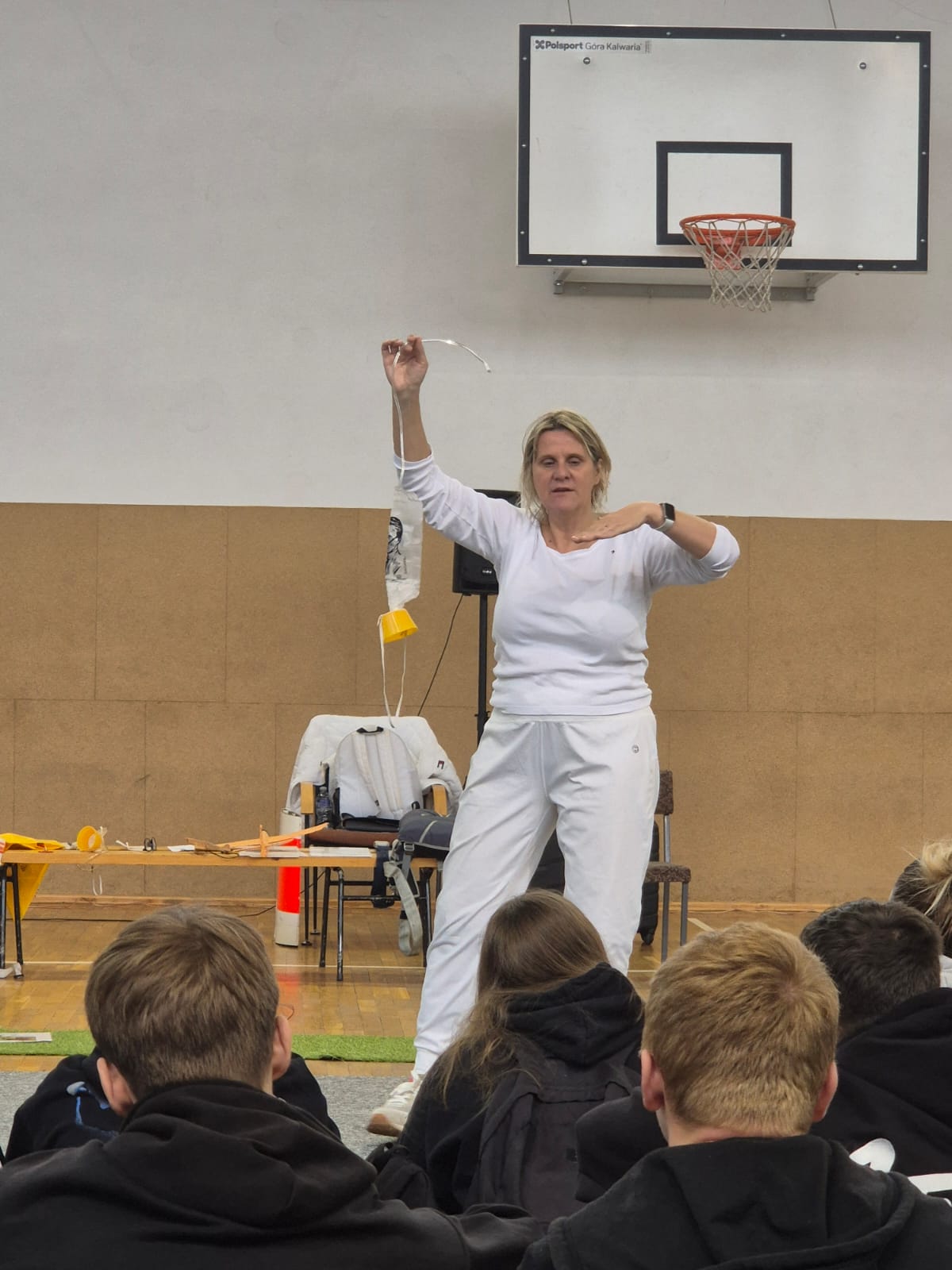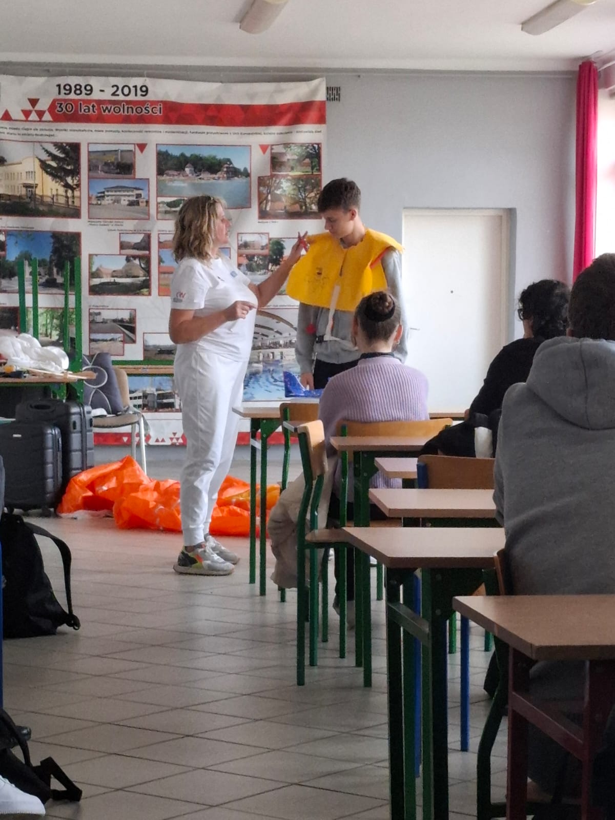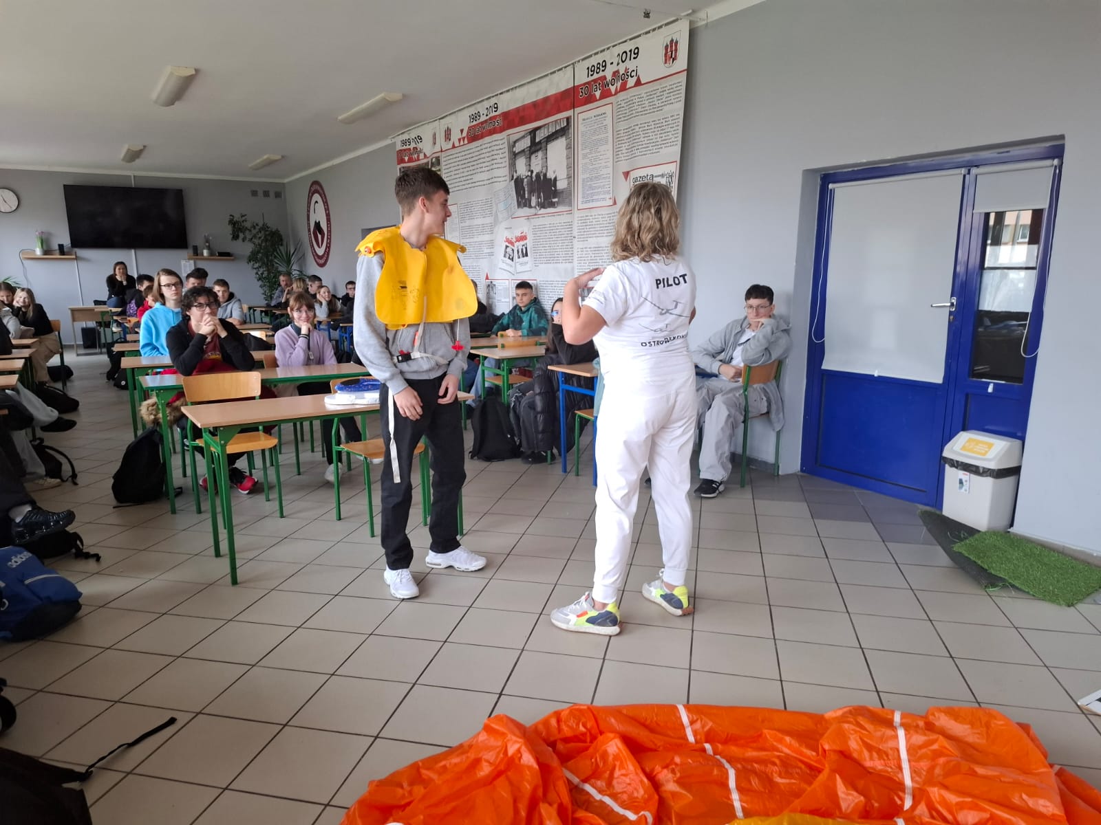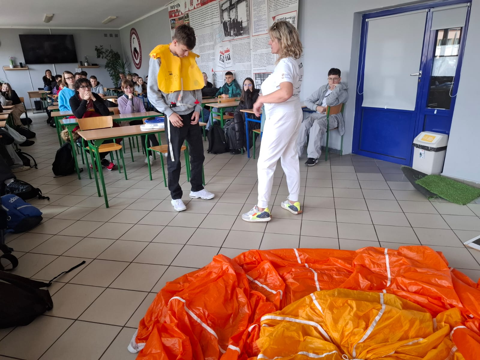 Uczniowie przymierzali prawdziwy spadochron, dowiedzieli się, jak działają kamizelki ratunkowe i maseczki tlenowe w samolotach pasażerskich, a także poznali rodzaje bagaży podróżnych i zasady ich prawidłowego pakowania.