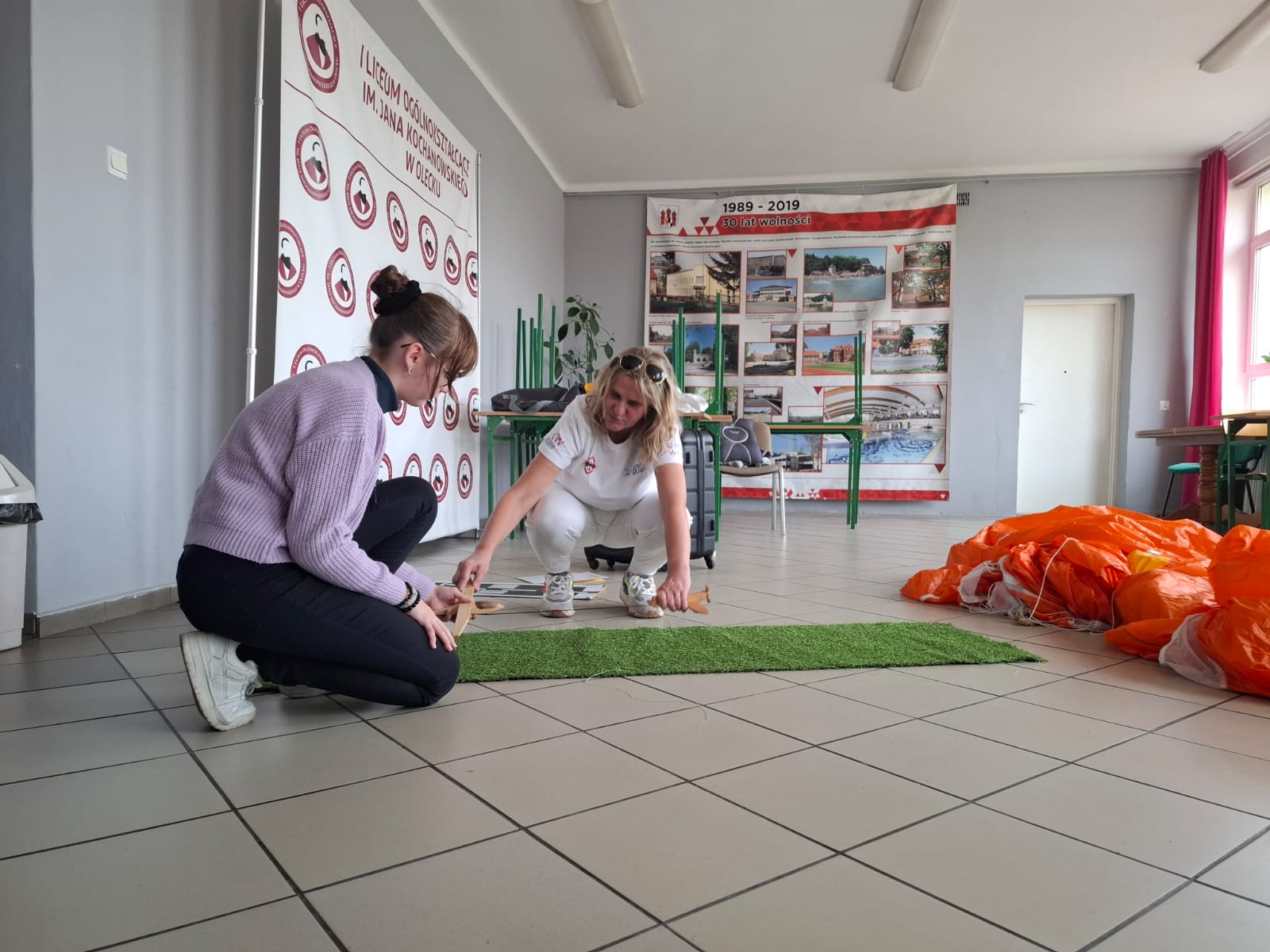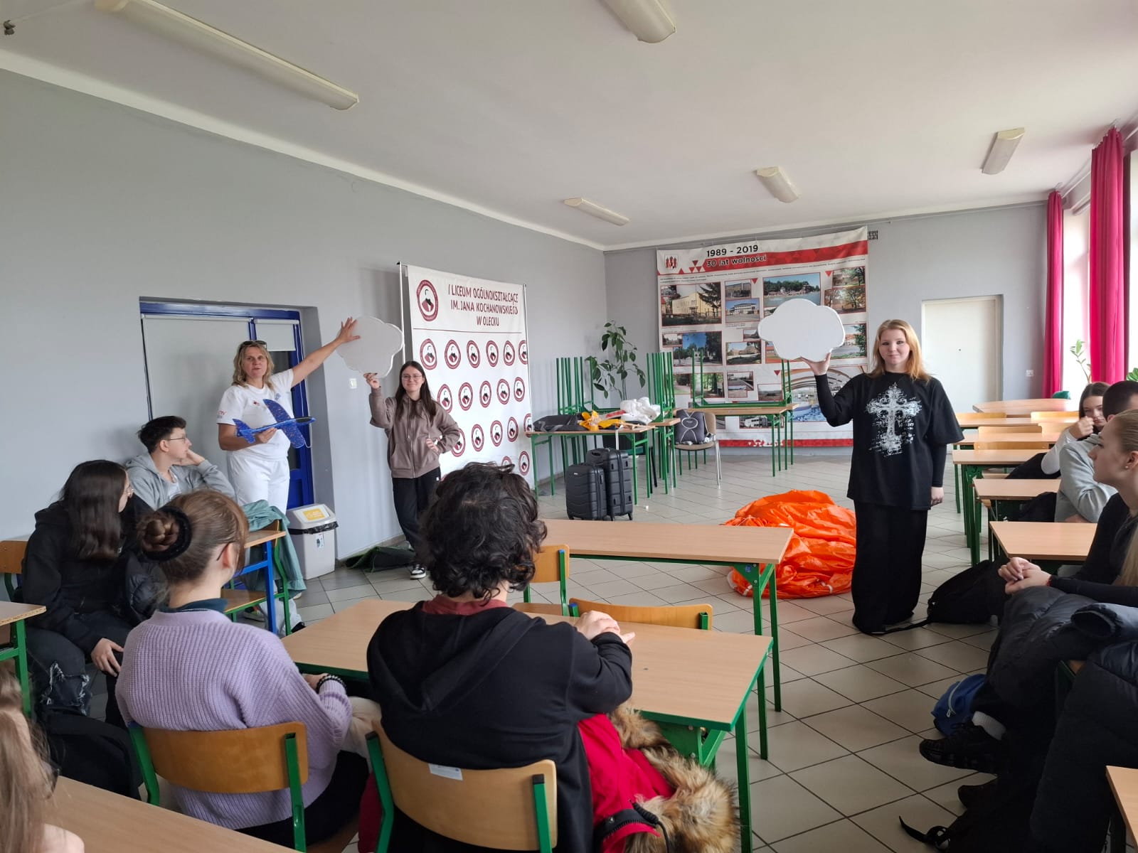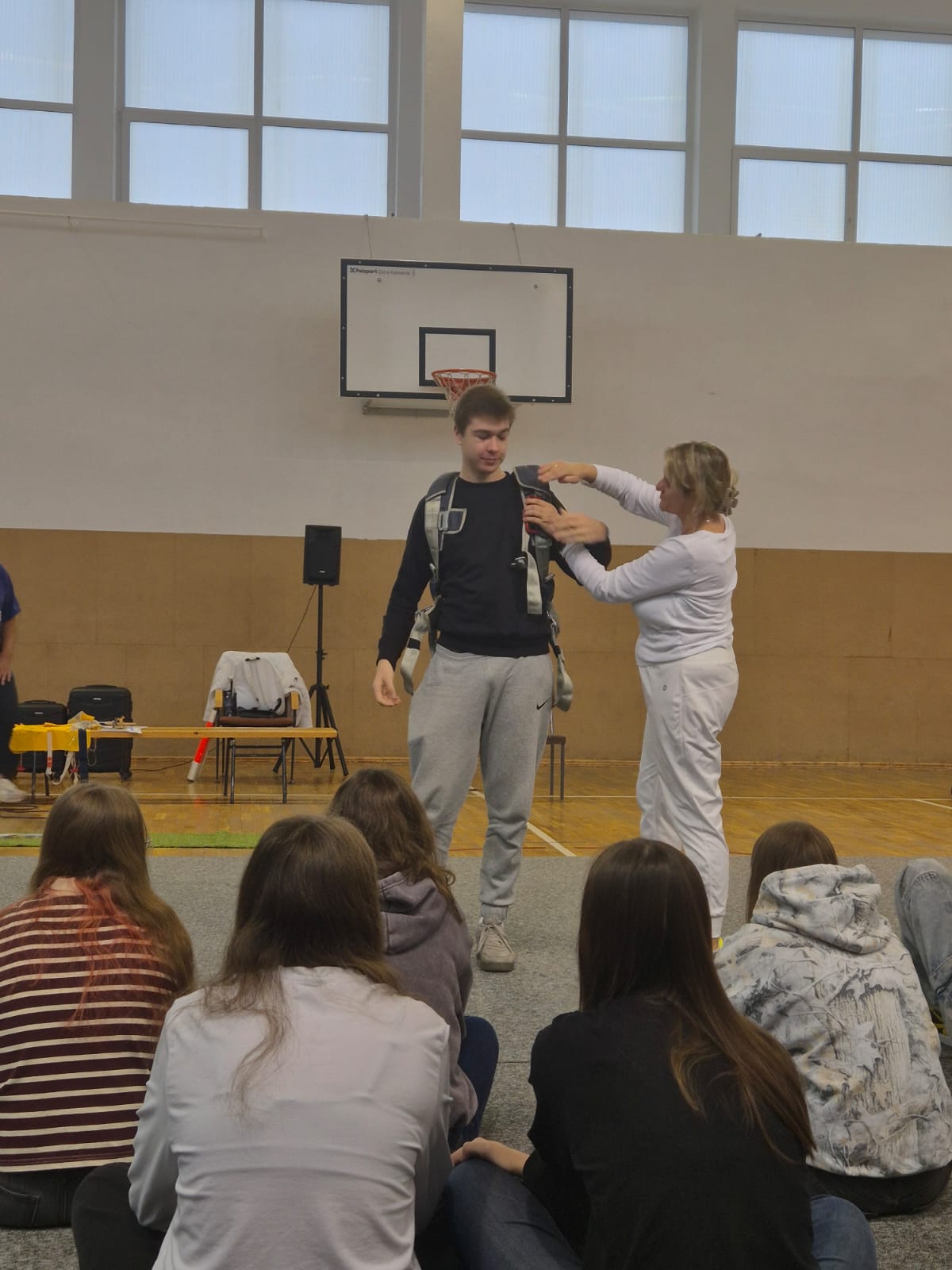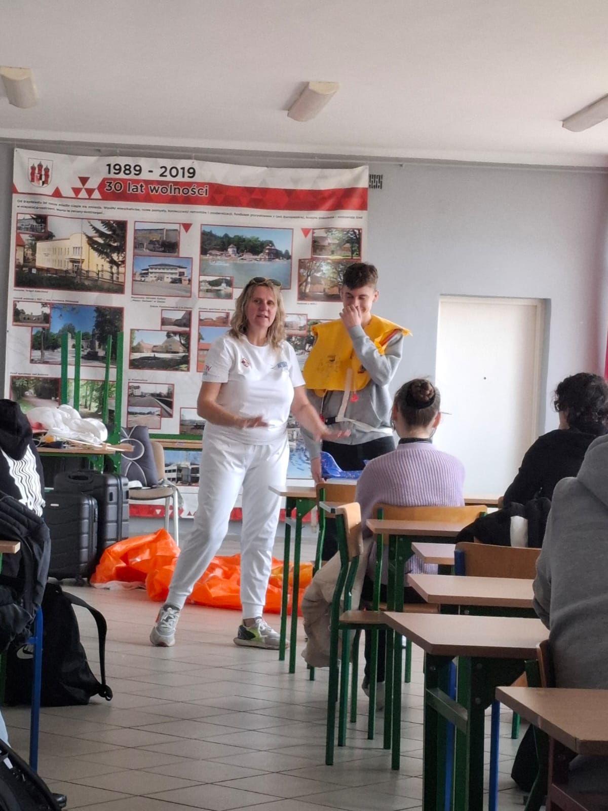Uczniowie przymierzali prawdziwy spadochron, dowiedzieli się, jak działają kamizelki ratunkowe i maseczki tlenowe w samolotach pasażerskich, a także poznali rodzaje bagaży podróżnych i zasady ich prawidłowego pakowania.