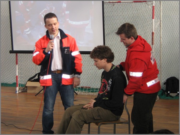 Konrad Lasota (I d). Goście pokazu – Tomasz Dziokan i Adrian Karch, ratownicy z